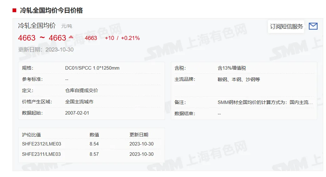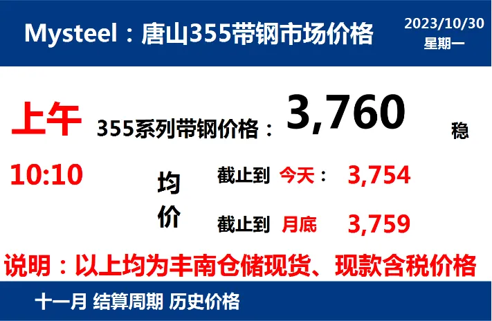 2023年10月30日,上午10:10, 唐山355系列带钢市场价格 3760元/吨,较昨稳;本月结算周期,截止到今天均价:3754元/吨,截止到月底:3759元/吨。