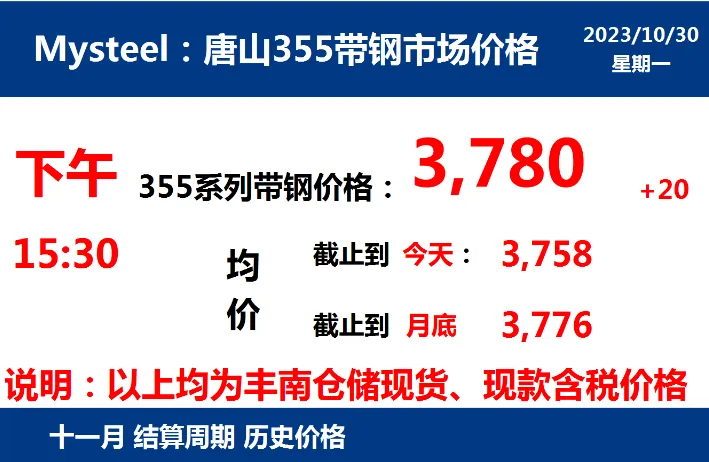 2023年10月30日,下午15:30, 唐山355系列带钢市场价格 3780元/吨,较昨涨20元/吨;本月结算周期,截止到今天均价:3758元/吨,截止到月底:3776元/吨。