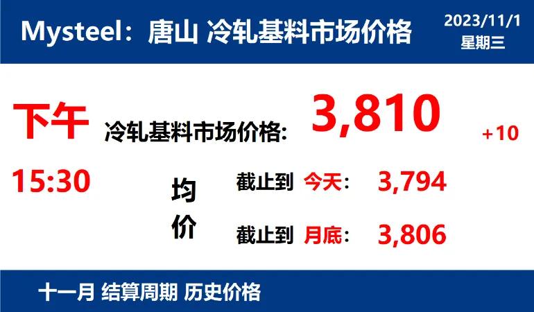 2023年11月1日,下午15:30, 唐山355系列带钢市场价格 3810元/吨,较昨涨10元/吨;本月结算周期,截止到今天均价:3794元/吨,截止到月底:3806元/吨。