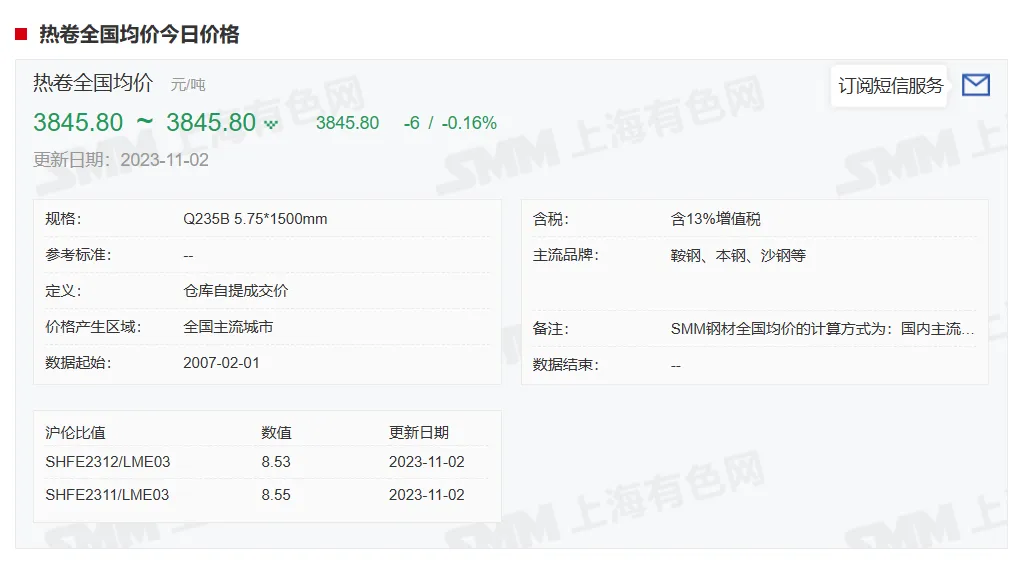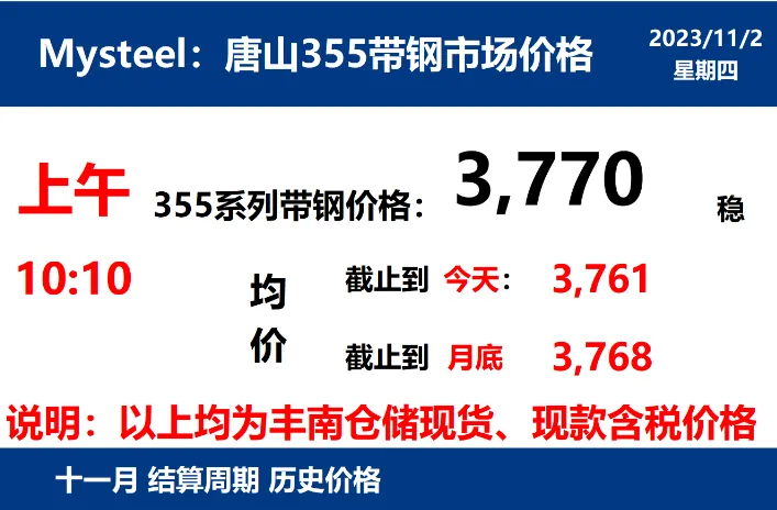 2023年11月2日,上午10:10, 唐山355系列带钢市场价格 3770元/吨,较昨稳;本月结算周期,截止到今天均价:3761元/吨,截止到月底:3768元/吨。