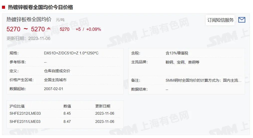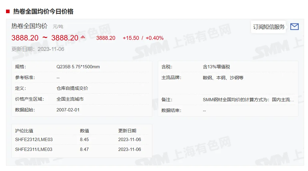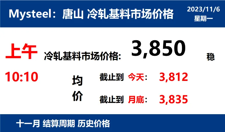 2023年11月6日,上午10:10, 唐山355系列带钢市场价格 3850元/吨,较昨稳;本月结算周期,截止到今天均价:3812元/吨,截止到月底:3835元/吨。