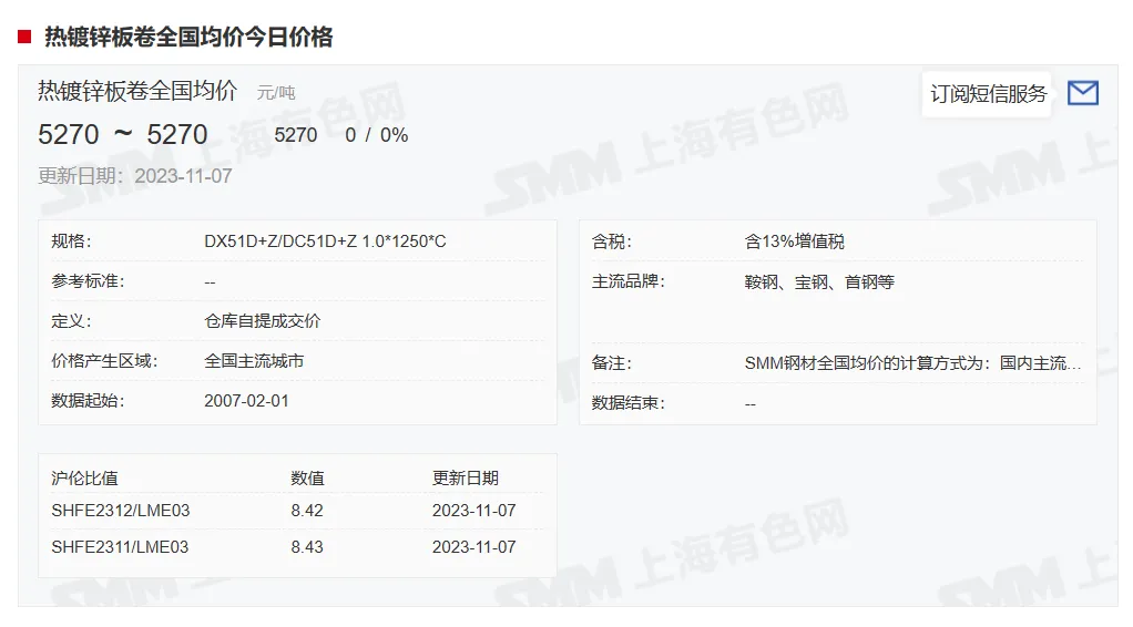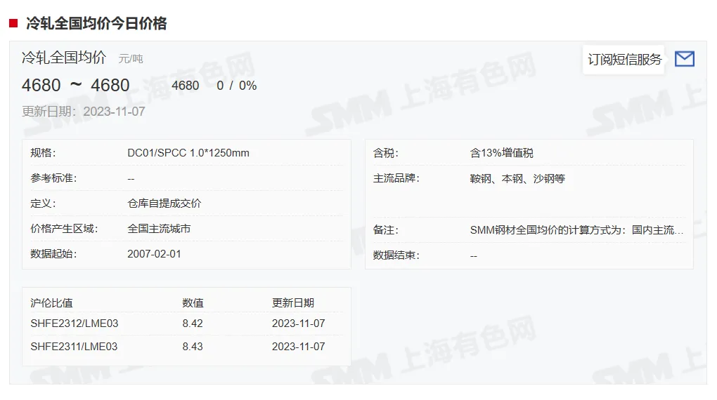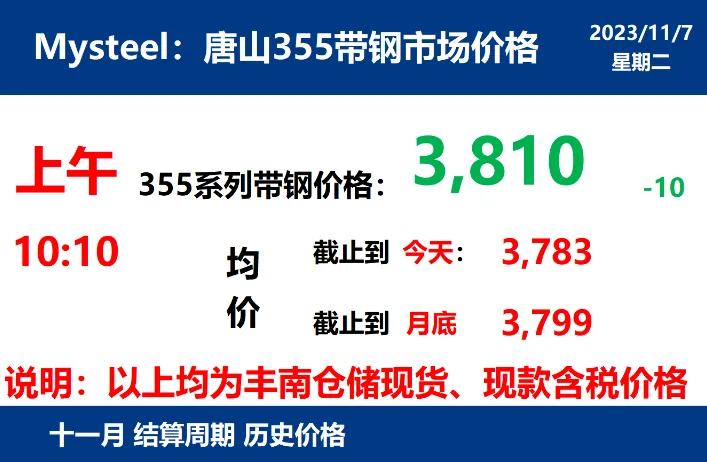 2023年11月7日,上午10:10, 唐山355系列带钢市场价格 3810元/吨,较昨降10元/吨;本月结算周期,截止到今天均价:3783元/吨,截止到月底:3799元/吨。