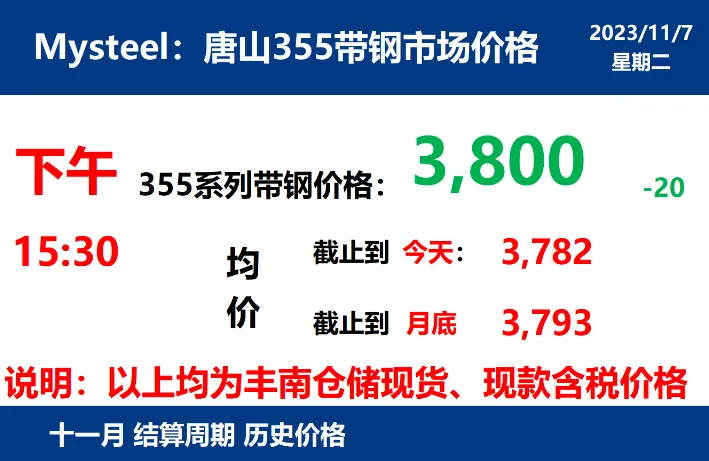 2023年11月7日,下午15:30, 唐山355系列带钢市场价格 3800元/吨,较昨降20元/吨;本月结算周期,截止到今天均价:3782元/吨,截止到月底:3793元/吨。