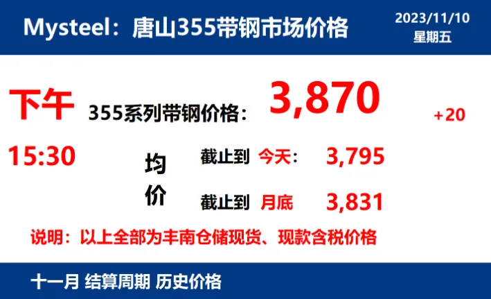 2023年11月10日,上午10:10下午15:30, 唐山355系列带钢市场价格3870 元/吨,较昨涨20元/吨;本月结算周期,截止到今天均价:3795元/吨,截止到月底:3831元/吨。
