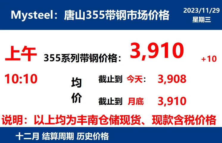 2023年月日,上午10:10, 唐山355系列带钢市场价格 3910元/吨,较昨涨10元/吨;本月结算周期,截止到今天均价:3908元/吨,截止到月底:3910元/吨。