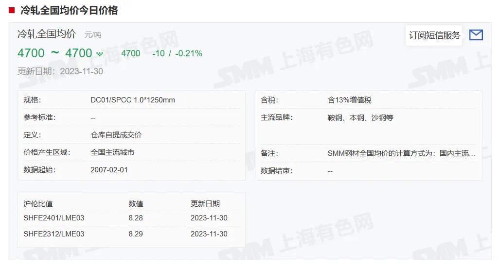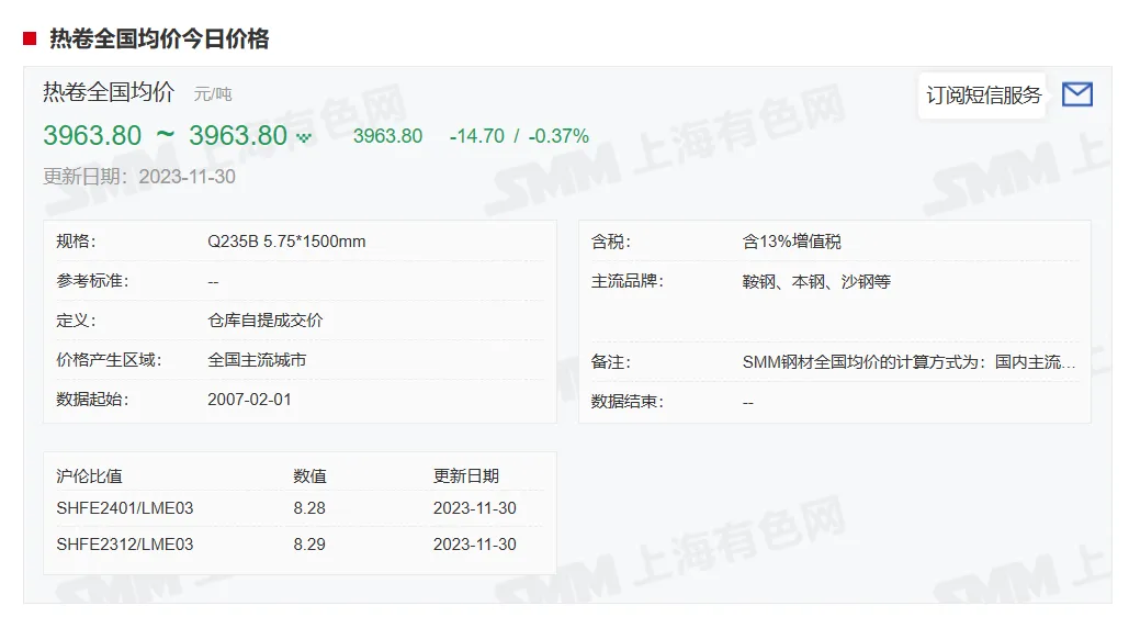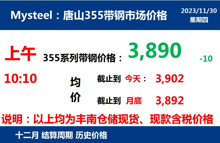 2023年11月30日,上午10:10, 唐山355系列带钢市场价格 3890元/吨,较昨降10元/吨;本月结算周期,截止到今天均价:3902元/吨,截止到月底:3892元/吨。