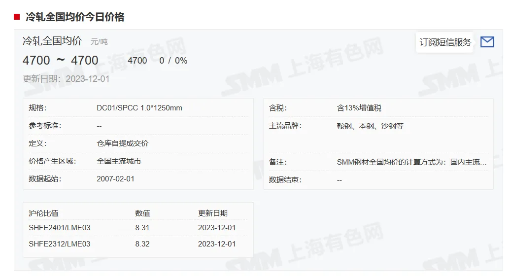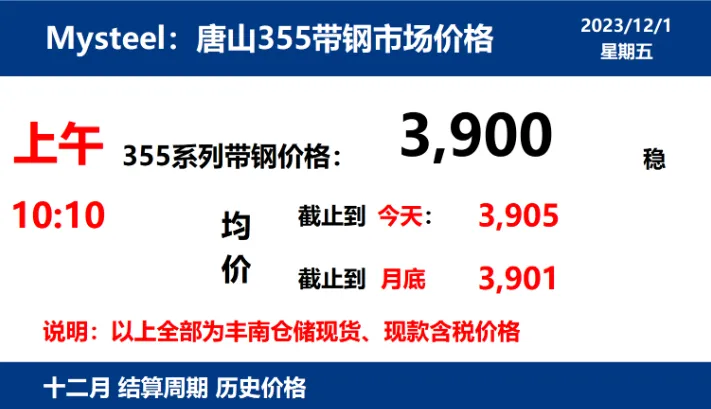 2023年12月1日,上午10:10, 唐山355系列带钢市场价格 3900元/吨,较昨稳;本月结算周期,截止到今天均价:3905元/吨,截止到月底:3901元/吨。