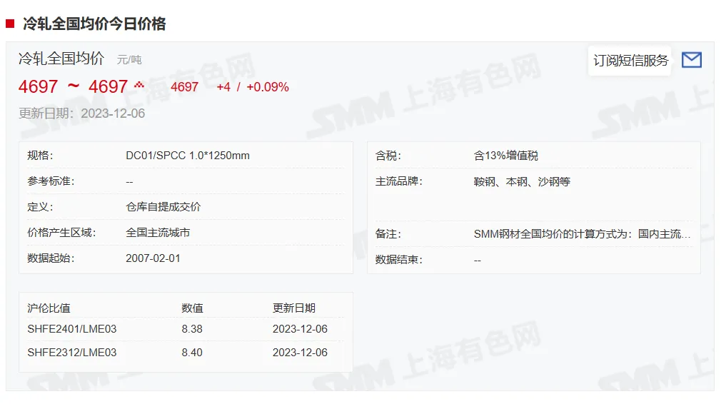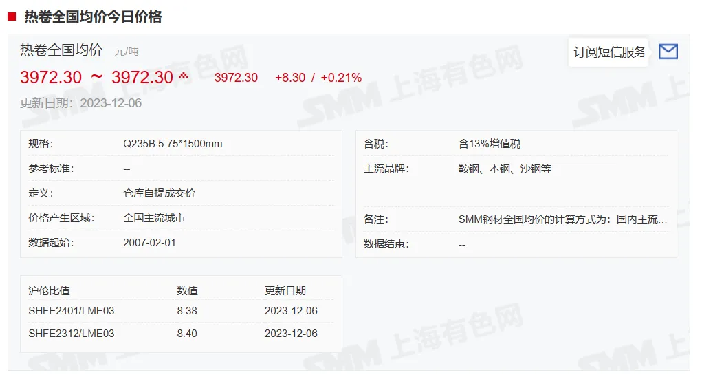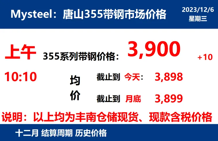 2023年12月6日,上午10:10, 唐山355系列带钢市场价格 3900元/吨,较昨涨10元/吨;本月结算周期,截止到今天均价:3898元/吨,截止到月底:3899元/吨。