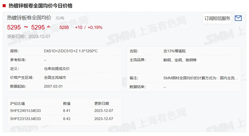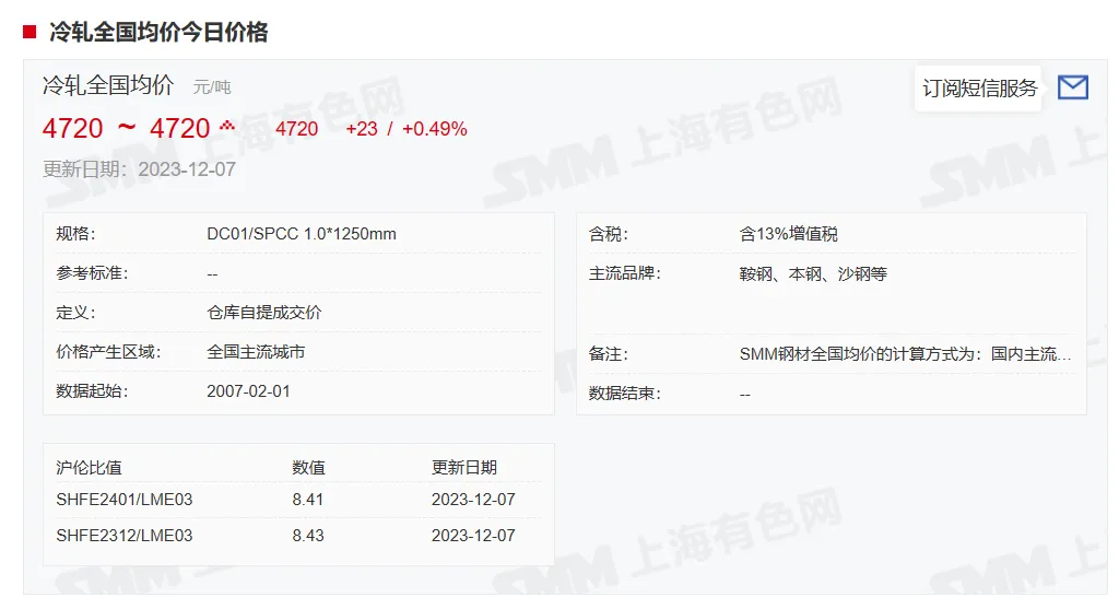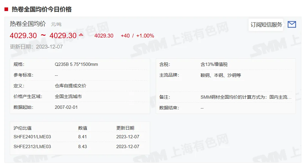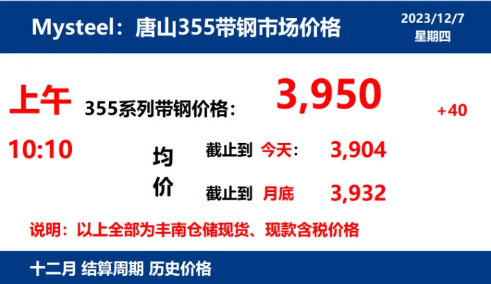 2023年12月7日,上午10:10, 唐山355系列带钢市场价格 3950元/吨,较昨涨40元/吨;本月结算周期,截止到今天均价:3904元/吨,截止到月底:3932元/吨。