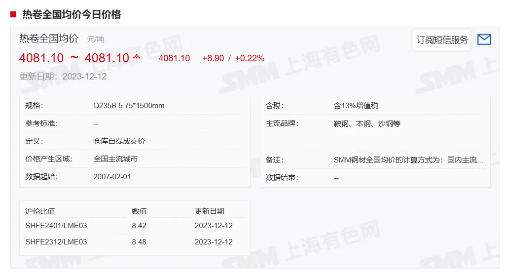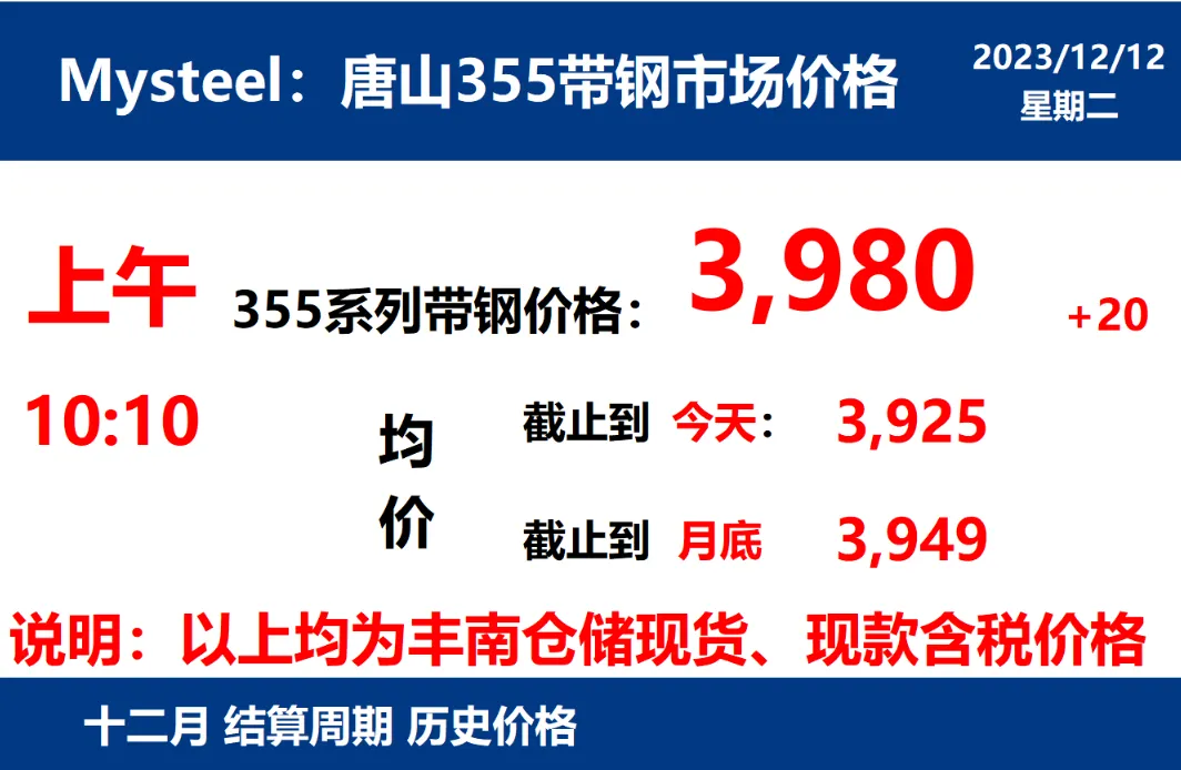 2023年12月12日,上午10:10, 唐山355系列带钢市场价格 3980元/吨,较昨涨20元/吨;本月结算周期,截止到今天均价:3925元/吨,截止到月底:3949元/吨。