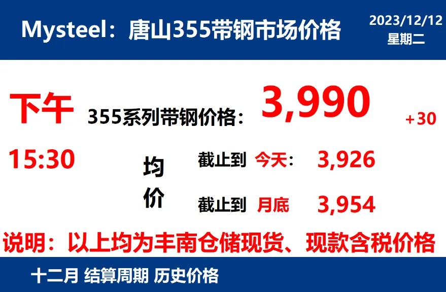 2023年12月12日,下午15:30, 唐山355系列带钢市场价格 3990元/吨,较昨涨30元/吨;本月结算周期,截止到今天均价:3926元/吨,截止到月底:3954元/吨。