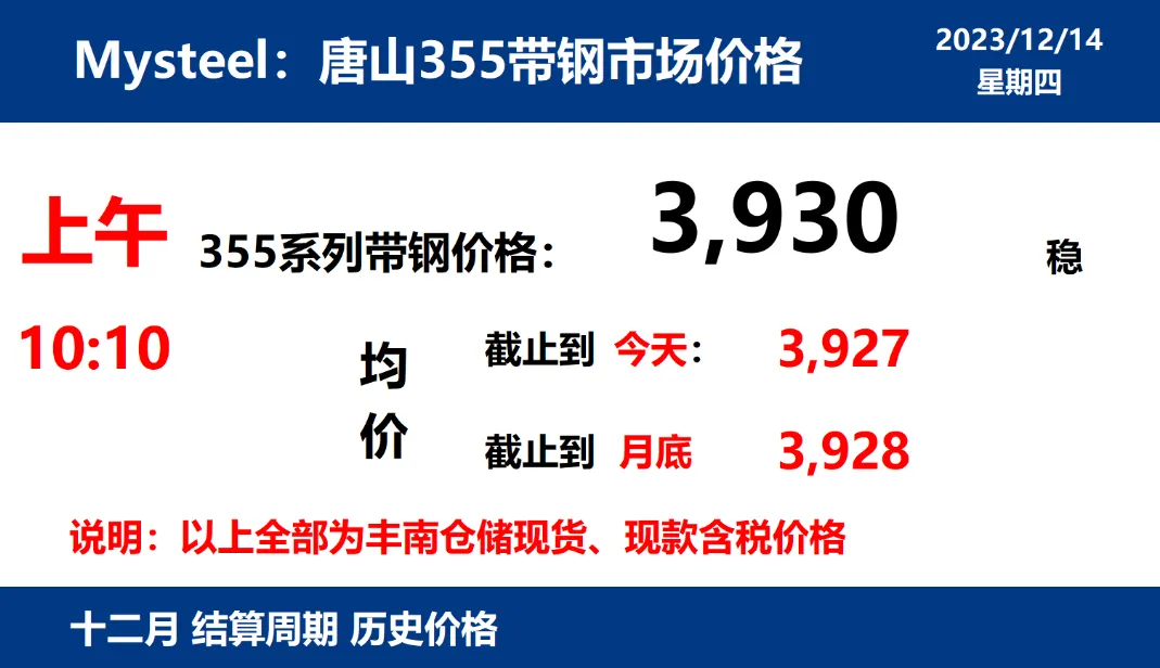 2023年12月14日,上午10:10, 唐山355系列带钢市场价格 3930元/吨,较昨稳;本月结算周期,截止到今天均价:3927元/吨,截止到月底:3928元/吨。