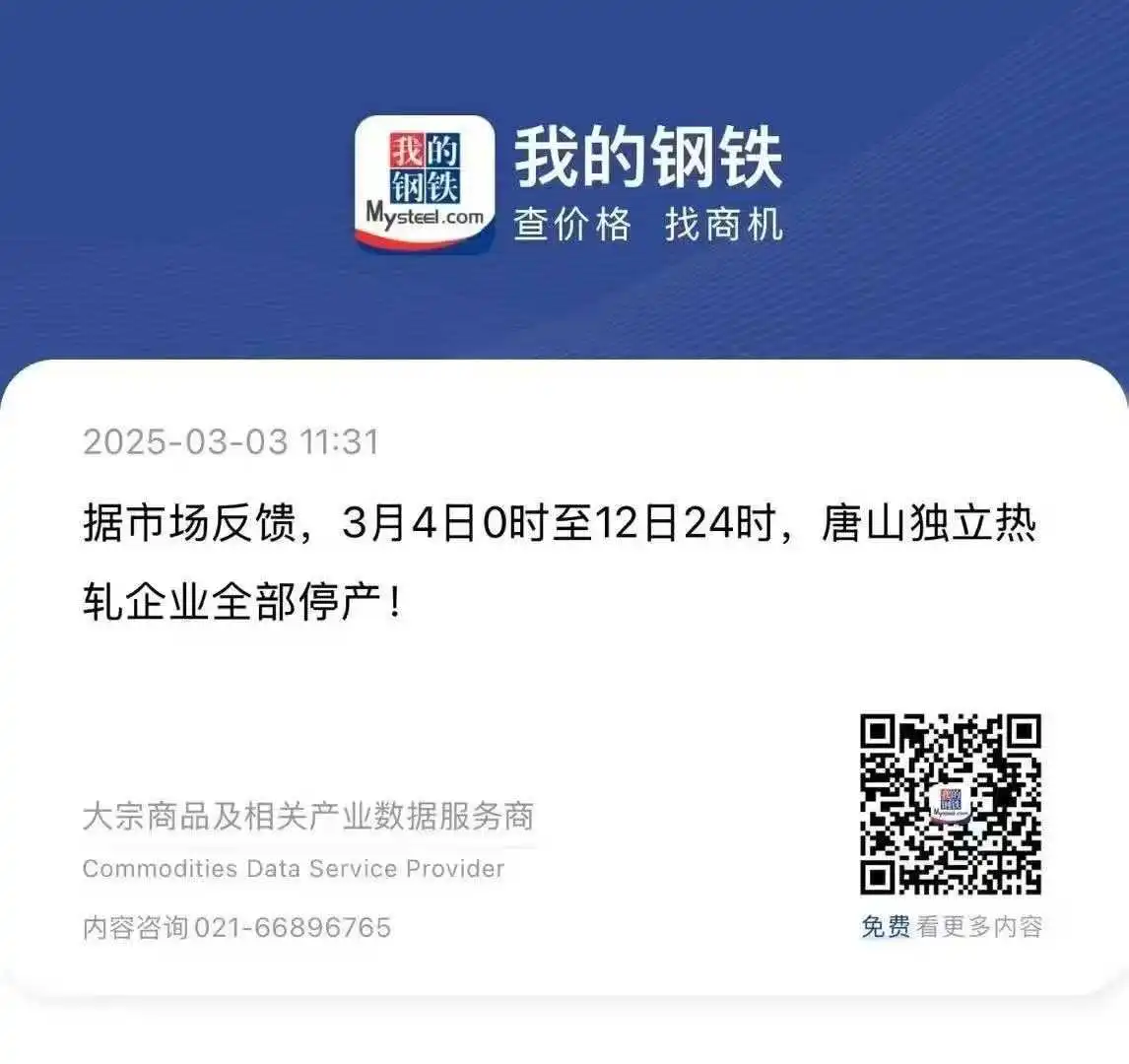 据我的钢铁调研,唐山部分独立型钢厂接到口头通知,3月4日0时至12日24时,唐山独立轧钢企业全部停产。