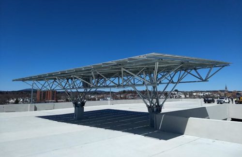 ReVision Energy完成了在新罕布什尔州安装的第一个太阳能车库。曼彻斯特市中心的太阳能遮阳篷位于一个新的六层停车库的顶层,与希尔顿花园酒店和东北三角洲牙科体育场隔街相望,这里是小联盟棒球队的新罕布什尔州Fisher Cats的主场。