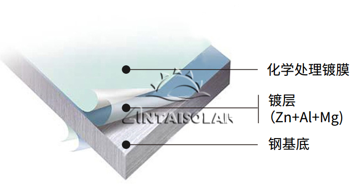 镀锌铝镁板的镀层是由锌(Zn)、铝(Al)、镁(Mg)高温固化形成,其显微结构由Zn、Al和Mg的致密三元共晶组织构成,从而使钢板表面形成一层致密的、有效防止腐蚀因子穿透的屏障。