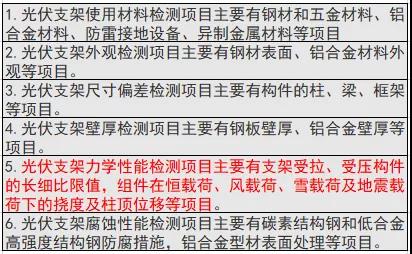 在我国,光伏支架的国家检测标准还尚未出台,只有JG/T490-2016《太阳能光伏系统支架通用技术要求》这部行业标准可供参考。光伏支架不同的指标具体检测项目: