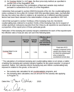 关于澳大利亚对华铝型材双反日落复审,澳洲调查机关于今日正式公布了终裁公告。厦门金固美能源科技有限公司的母公司福建固美金属有限公司最终获得了1%的反倾销和反补贴合并税率。新的反倾销反补贴税率将于2020年10月28日之后开始执行。此次反倾销调查的成功申辩,不仅证明了固美公司在澳洲的影响力,同时也进一步夯实了金固美公司在澳洲的市场基础。