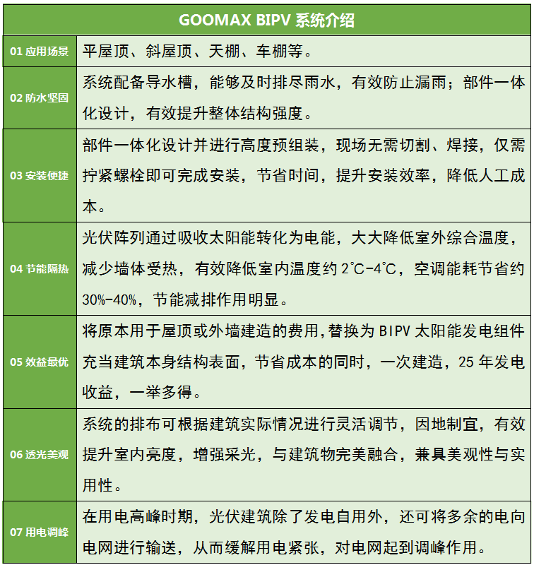 GOOMAX BIPV系统的安装建设,同时兼顾建筑的基本功能需求和发电需求,以清洁能源供能、降低建筑能耗、提升建筑环境友好,不仅让企业自身用电实现“自给自足”,同时带给企业“节能减排、节省土地、降低成本、附加收益”等众多益处。