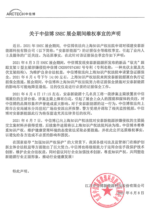 近日,2021年SNEC展会期间, 中信博依法向上海知识产权法院申请对福建安泰新能源科技有限公司(以下简称:“安泰新能源”)的证据保全等维权事宜,引起了业内人士及媒体的广泛关注。为还原事实,在此针对该证据保全事宜作如下声明: