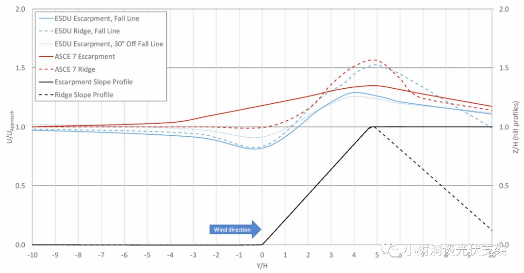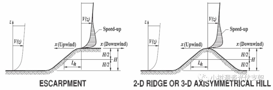 这里多说几句,由于大坡度会对大气边界层造成“挤压”,也就是在山顶和山腰,风速会有非常大的“突跃(Speed Up)”,小树洞也曾专门做过这方面的研究,在山顶上或者山腰的风压,与平地的风压比较,会有1.5~3倍的增大。理论上这些地区是不适合建设跟踪器甚至固定支架项目的。