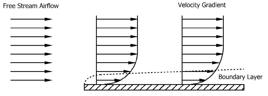 我们知道不管气体也好,液体也好,实际的流体都是有黏性的,流体的黏性是指流体微团间发生相对滑移时产生切向阻力的性质,也就是摩擦力。当空气流进过一个平板,由于受到平板上的摩擦力影响,在近平板上气流流动速度为零,从近平板到远离平板,速度逐渐增大,从而形成一个速度梯度,就像一个“气流边界”。