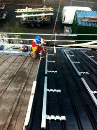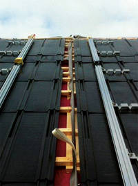 该InterSole系统被直接安装在屋顶的隔热层,和由被固定在屋顶板条像屋瓦耐用的HDPE片。这些塑料片材搭接像砖,从而保证不进水。太阳能电池组件,然后安装到纸张。由于可调节的模块夹具,几乎所有市售框和无框光伏组件可以集成到屋顶。该InterSole系统适用于屋顶的15°至60°的节距。调节安装支架的高度的能力使得太阳能安装要和谐插入到屋顶。