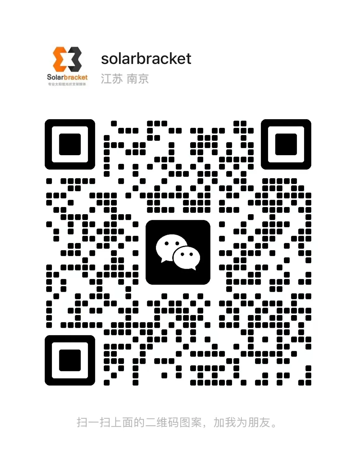 添加微信好友 感谢您关注我们。如有业务合作与咨询、技术交流,请添加微信进一步了解沟通。 微信号: solarbracket_cn Thanks for following us. For business cooperation and consultation, please add WeChat for further communication. WeChat: solarbracket_cn 点按下方微信二维码,扫一扫添加好友